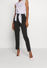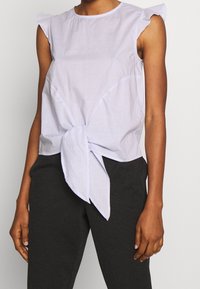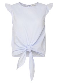 Haut sans manches bleu clair à fines rayures, avec des épaules volantées et un détail noué à l'avant, porté avec un pantalon noir.