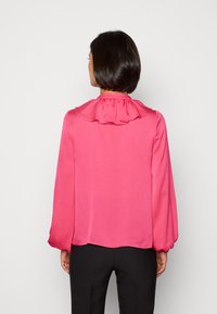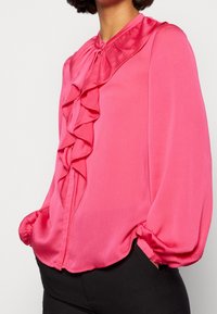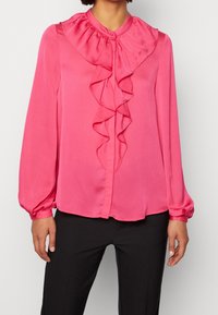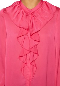 Blouse rose avec un col montant à volants, des manches longues et une patte de boutonnage sur le devant ; confectionnée dans un tissu léger et lisse.