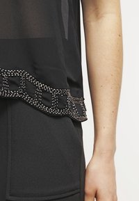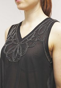 Haut sans manches noir avec perles décoratives sur le col, associé à une jupe crayon noire ajustée avec une fente devant et deux poches.