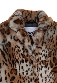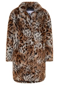 Long manteau en fausse fourrure avec motif animalier marron, noir et blanc et large col, présenté sur un cintre contre un fond blanc.
