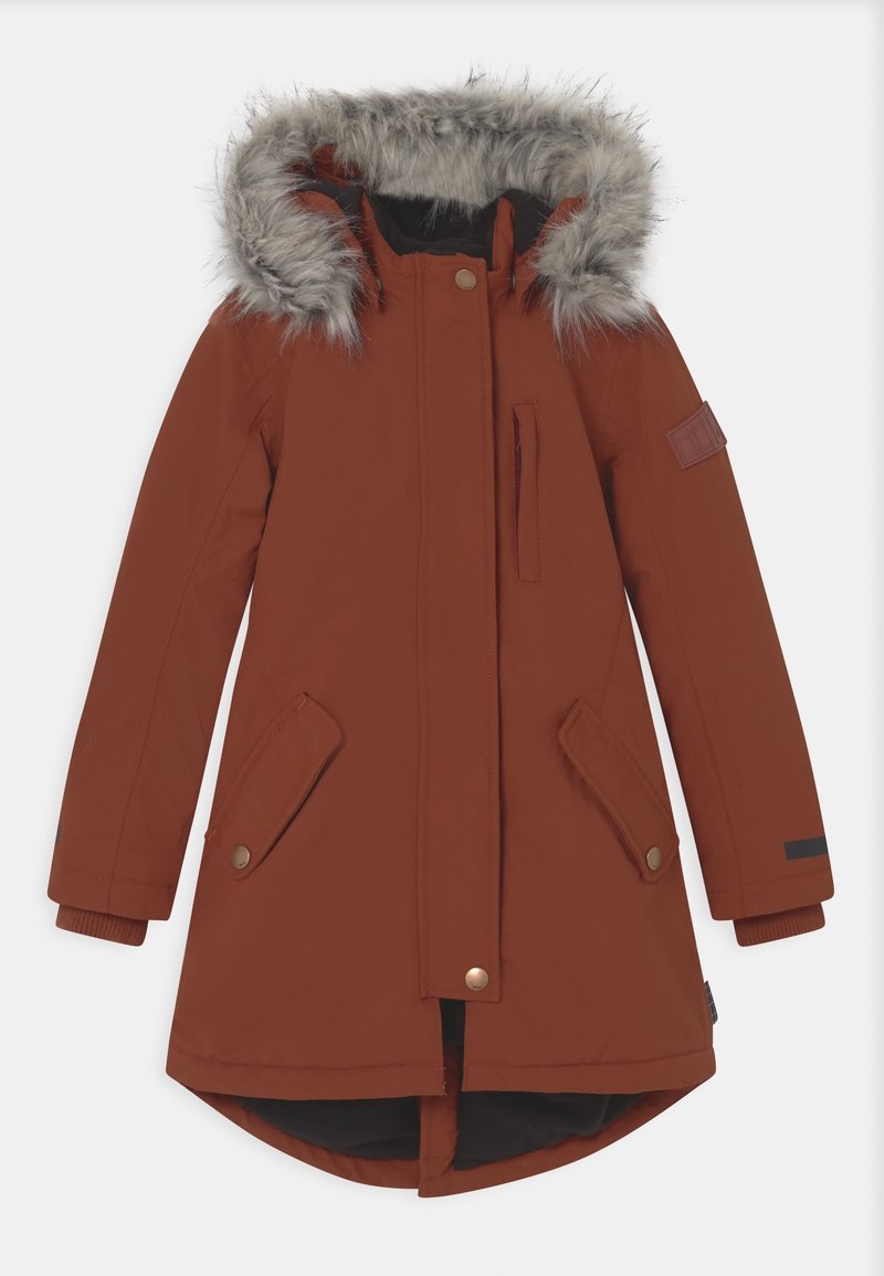 Manteau d'hiver long couleur rouille avec capuche en fausse fourrure, poches à rabat et poche poitrine zippée, conçu pour les temps froids.