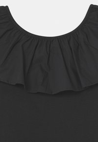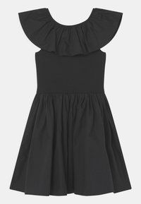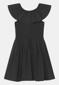 Robe noire avec un corsage ajusté, une jupe évasée et un col large à volants. Fabriquée en tissu doux, avec une texture lisse sans motifs.
