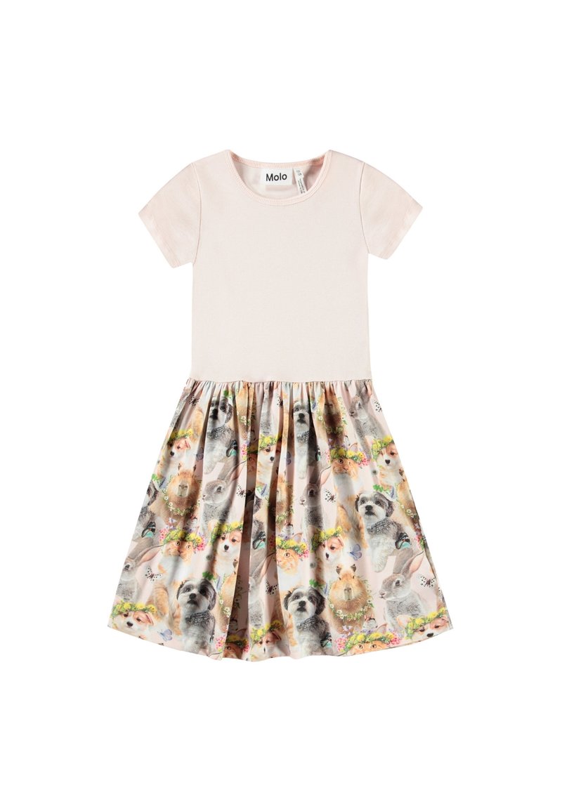 Robe à manches courtes avec un haut rose uni et une jupe plissée à motifs comportant des animaux avec des accents floraux. Tissu doux, divers motifs animaliers.