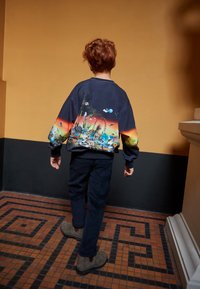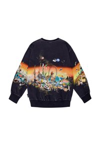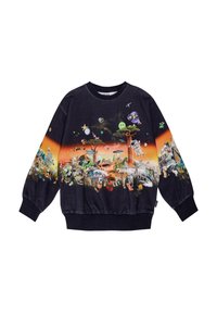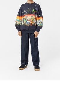 Sweatshirt marine avec un imprimé graphique coloré et surréaliste représentant divers animaux, paysages et objets, mêlant des couleurs et des textures vibrantes.