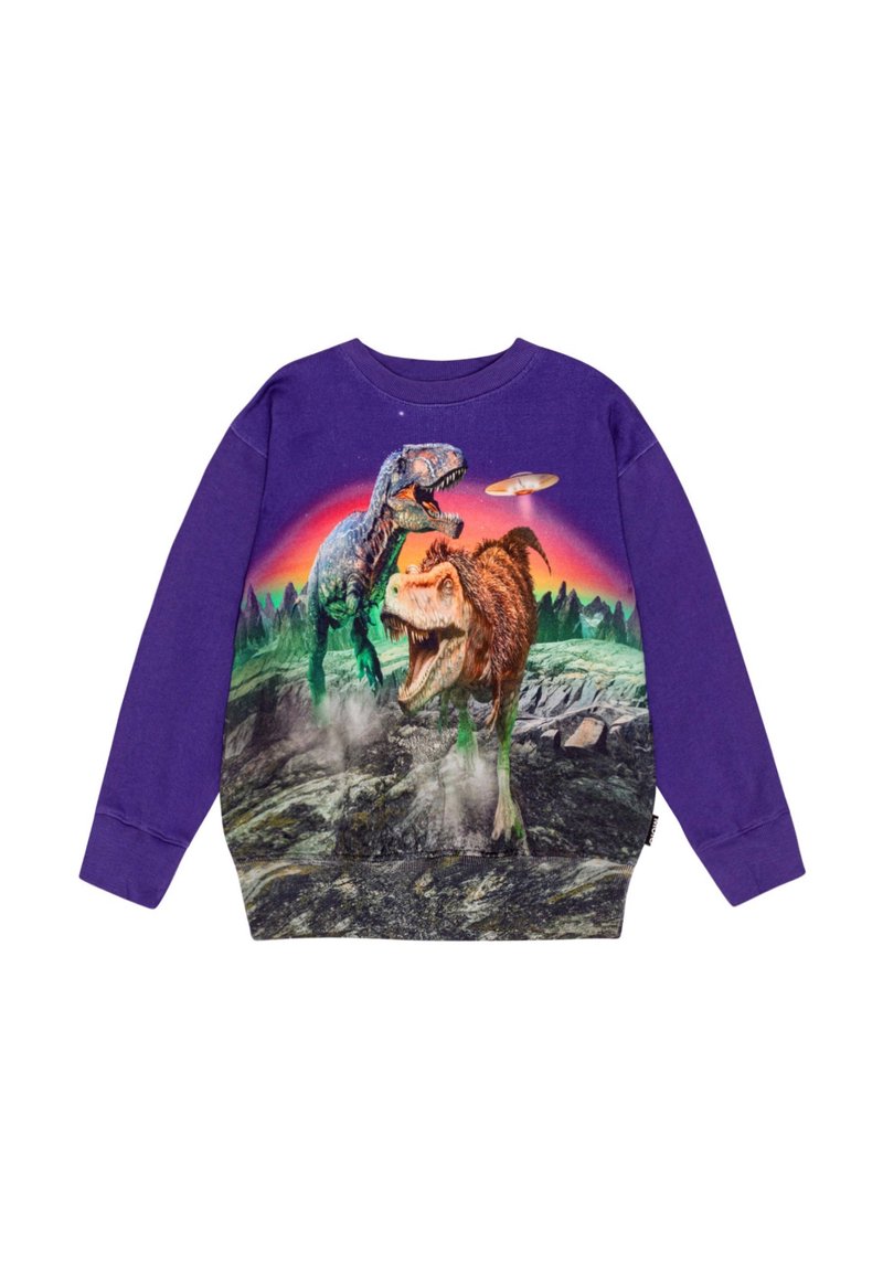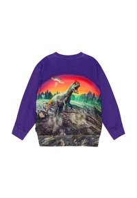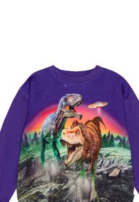 Sweatshirt violet avec un graphique de deux dinosaures sur un paysage rocheux avec un OVNI, imprimé sur le devant. Manches longues, en coton.