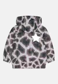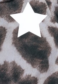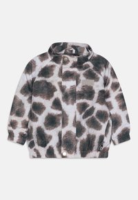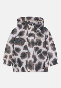 Veste en imprimé léopard avec capuche, présentant une texture de tissu doux dans des nuances de marron et de blanc, avec des fermetures à pression et des poignets élastiques.