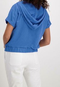 Femme portant un sweat à capuche bleu à manches courtes avec fermeture éclair et un pantalon blanc, arborant un grand texte bleu et noir à l'avant.