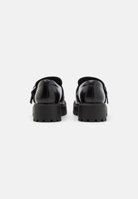 Mocassins en cuir noir avec une plateforme épaisse, dotés d'une large sangle, de coutures détaillées et d'une silhouette profilée. Semelle en caoutchouc texturé.