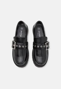 Mocassins en cuir noir avec une boucle en argent proéminente, dotés d'une semelle épaisse texturée et d'un design à bout rond.