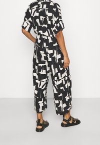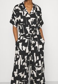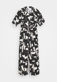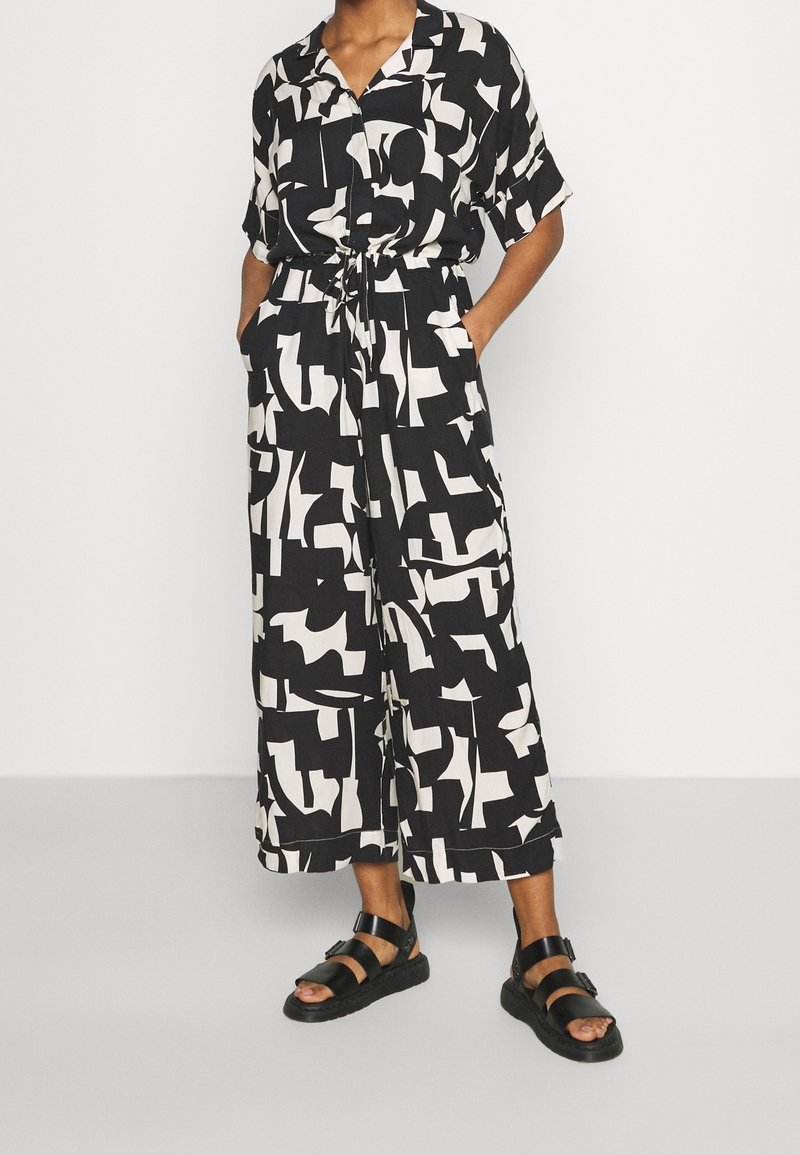 Combinaison noire et blanche à motifs abstraits, manches courtes, boutonnée sur le devant, taille ajustable par cordon, avec poches latérales. Portée avec des sandales plates noires.
