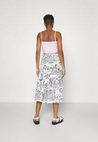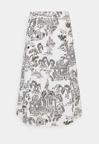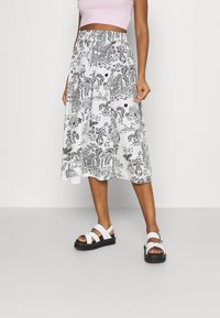 Jupe midi blanche avec imprimé noir à thème nature, dotée d'une taille élastique et d'une coupe fluide. Associée à des sandales blanches avec semelle noire.