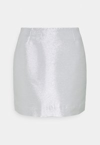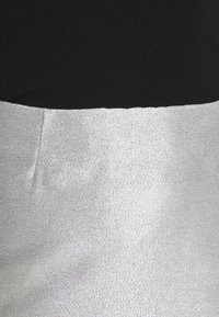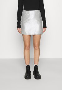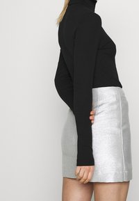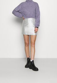 Mini-jupe en métal argenté avec une texture lisse, associée à un haut noir à manches longues et des bottines noires.