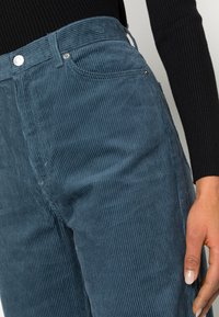 Pantalons en velours côtelé à jambe large de couleur bleu muted avec des rayures verticales, taille haute et finition texturée, associés à des baskets noires montantes.