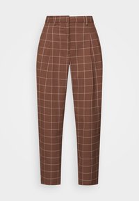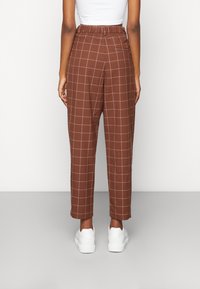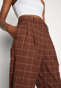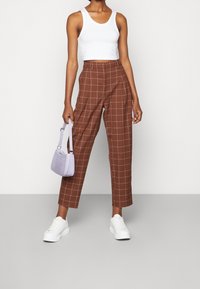Pantalon à carreaux marron taille haute, avec une coupe droite et des lignes nettes. Assorti à des baskets blanches pour créer un contraste.