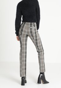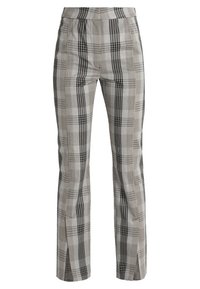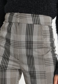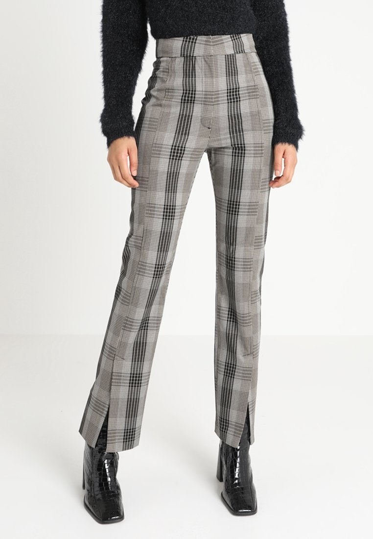 Femme portant un pantalon gris à carreaux taille haute avec des fentes à l'avant des jambes, un pull noir texturé et des bottines noires à talons.