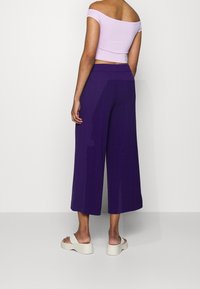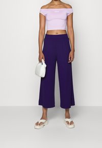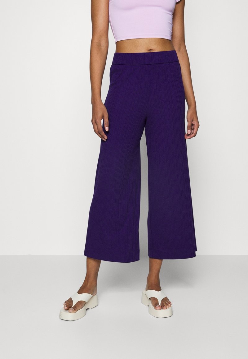 Pantalons larges violets avec une texture côtelée, dotés d'une taille haute. Associés à des sandales à plateforme blanches.