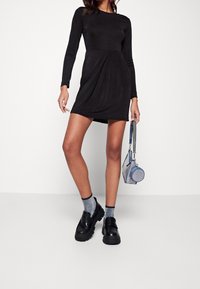Femme portant une mini robe noire à manches longues avec des plis, des chaussettes pailletées argentées et des mocassins noirs à semelle épaisse, debout devant un fond blanc.