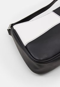 Sac d'épaule bicolore noir et blanc avec une forme incurvée, une texture lisse et une seule bandoulière réglable. Fermeture éclair avec détail de couture.