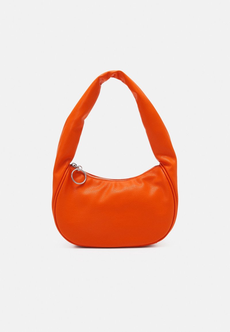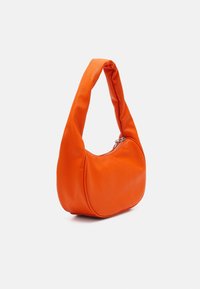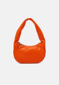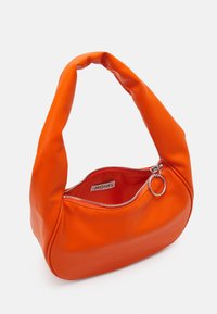 Sac à main en cuir orange de forme arrondie, avec une poignée torsadée et une fermeture éclair argentée munie d'une languette ronde. Texture lisse.