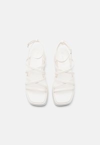 Sandales plateformes blanches avec plusieurs brides entrecroisées et boucle ajustable à la cheville. Texture lisse et construction solide avec une base large.