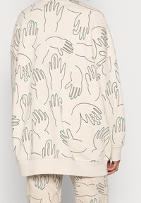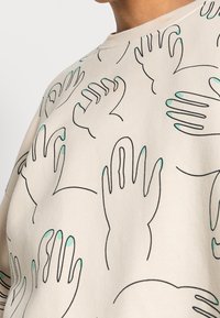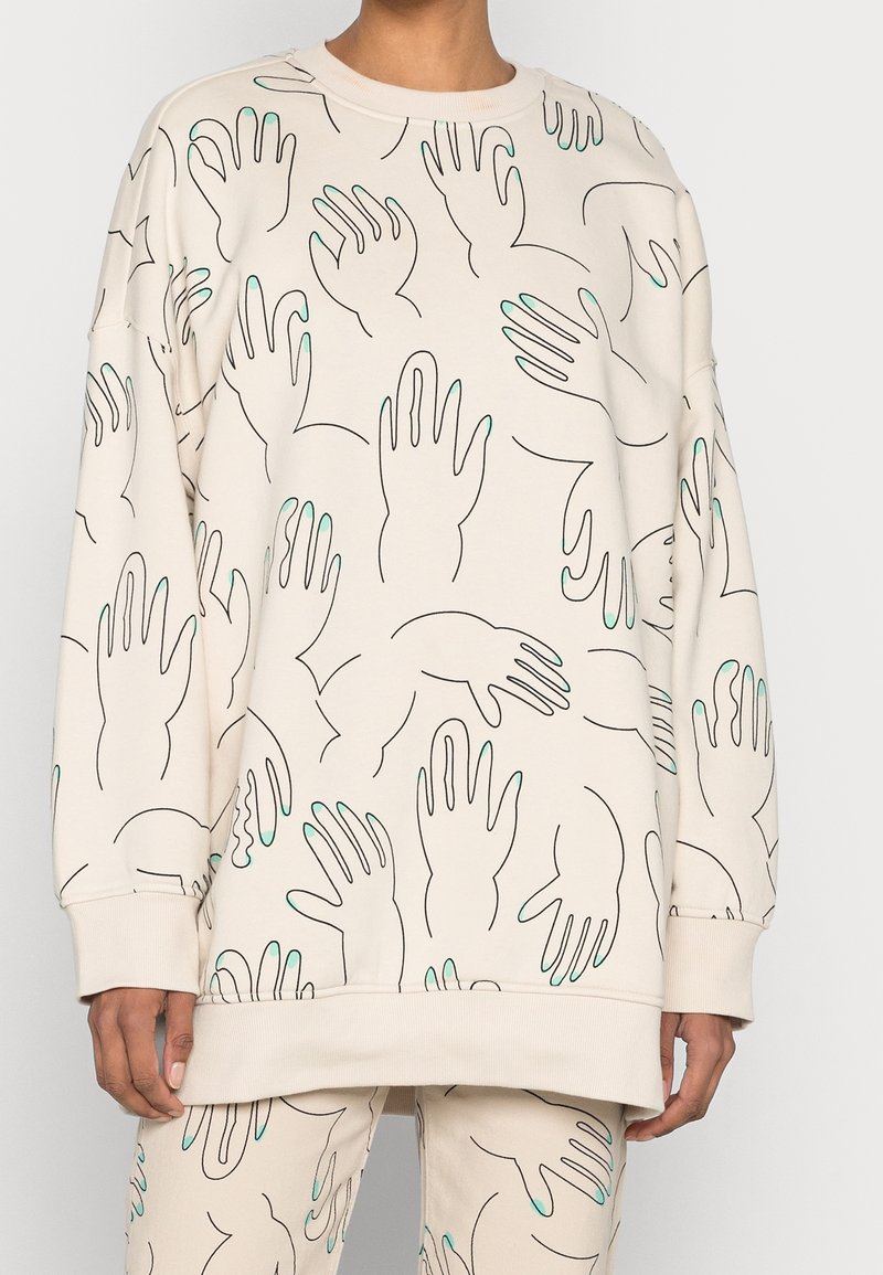 Sweat-shirt et pantalon beige clair avec des motifs de mains dessinés en contour noir aux doigts verts, portés par une personne avec le cou et les mains visibles.
