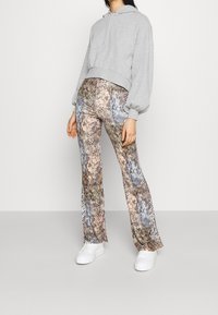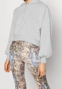 Personne portant un sweat à capuche court gris clair avec cordons de serrage et un legging taille haute à motif peau de serpent multicolore.