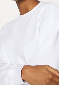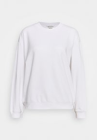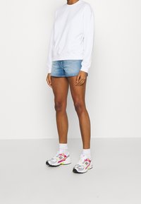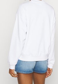 Sweat-shirt blanc à col rond, manches longues et coupe décontractée. Associé à un short en denim, illustrant un style décontracté et minimaliste.