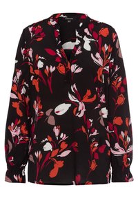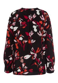 Blouse noire à manches longues avec un motif floral rouge, rose et blanc, col en V fendu et poignets froncés.