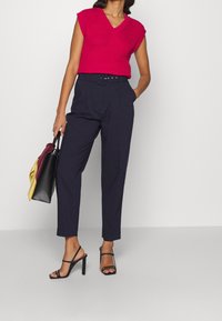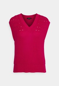 Femme portant un gilet sans manches en tricot rose vif avec un col en V et un pantalon noir, debout devant un fond uni.