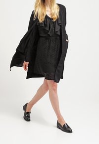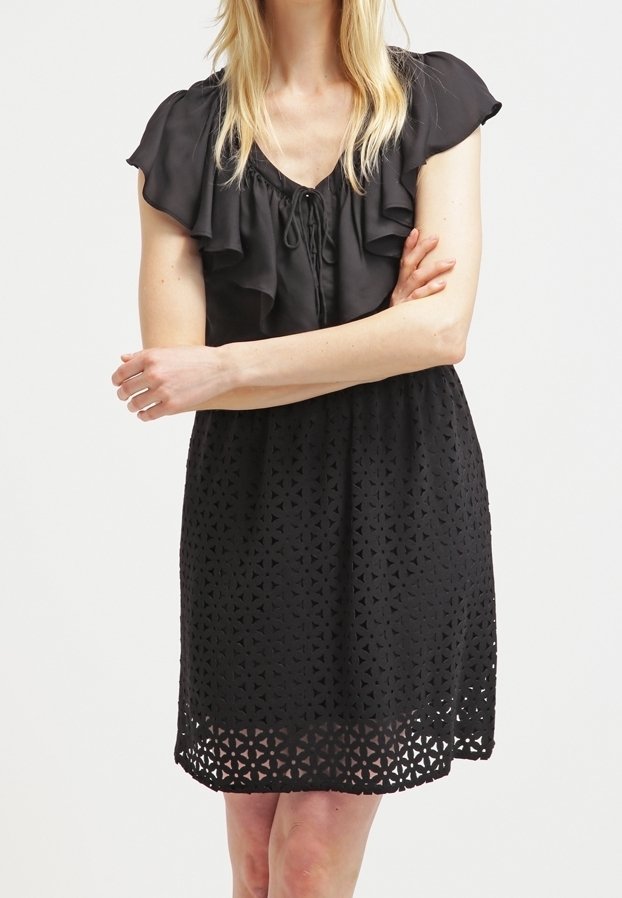 Robe noire avec manches courtes à volants, taille froncée et motif découpé texturé sur la jupe. Matière légère, longueur au-dessus du genou.