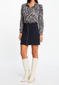 Femme portant un chemisier à manches longues à fleurs rentré dans une mini-jupe noire avec fermeture éclair sur le devant et des bottes blanches hautes jusqu'aux genoux.