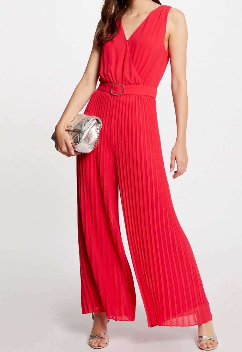 Combinaison rouge sans manches avec un col en V, un design plissé et une taille ceinturée. Associée à une pochette argentée matelassée et des sandales brillantes.