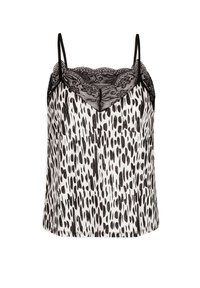 Femme portant un short blanc taille haute avec ceinture et un caraco à imprimé animalier noir et blanc avec bordure en dentelle noire.