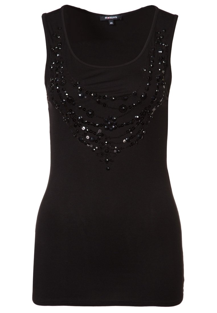 Débardeur noir sans manches à encolure dégagée, orné de sequins noirs et de motifs de perles sur la poitrine.