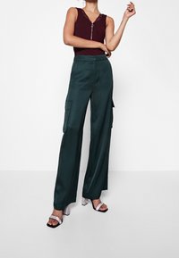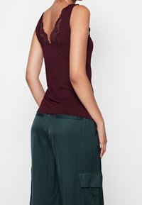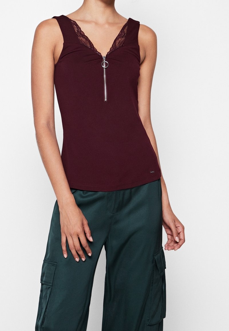 Débardeur bordeaux avec une bordure en dentelle au niveau du décolleté en V et détail de fermeture éclair argentée. Porté avec un pantalon cargo vert ample. Tissu doux, design ajusté.