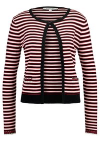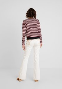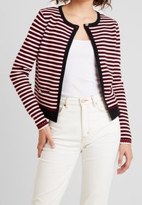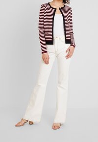 Femme portant un cardigan rayé rouge, noir et blanc sur un débardeur blanc avec un jean blanc taille haute devant un fond uni.