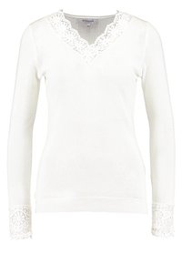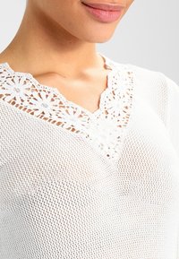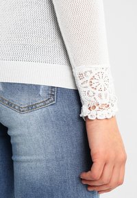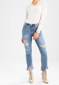 Haut blanc à manches longues avec un décolleté en V en dentelle et des accents en dentelle aux poignets, associé à un jean en denim bleu taille haute avec des détails déchirés.