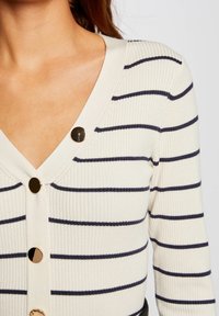 Cardigan à rayures crème et marine en ribbed avec un décolleté en V et des boutons dorés, associé à un short en cuir noir taille haute avec une ceinture nouée.