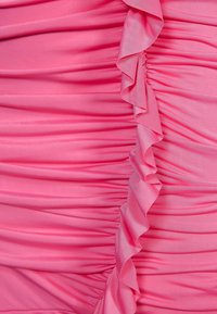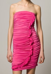Robe rose sans bretelles avec des fronces plissées, un accent volanté sur un côté et une silhouette ajustée avec une longueur au genou.