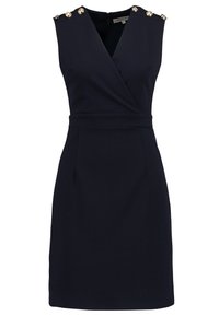 Robe noire sans manches avec un design enveloppant, décolleté en V profond et détails en boutons dorés sur les épaules. Présente une silhouette ajustée et des poches latérales.