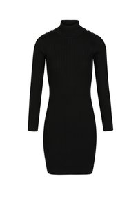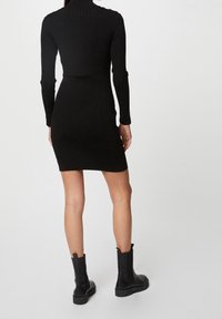 Femme marchant dans une robe noire moulante côtelée à manches longues et des bottines noires, sur un fond clair uni.