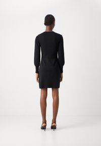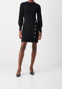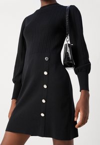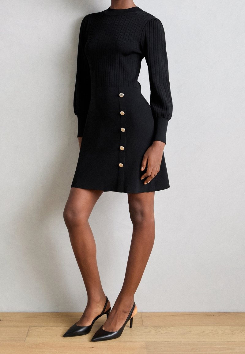 Femme portant une robe noire côtelée à manches longues avec des boutons dorés sur le côté et des escarpins noirs à bout pointu avec brides arrière.
