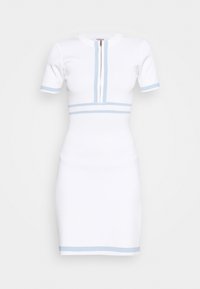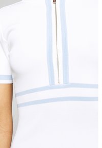Robe blanche à manches courtes avec une fermeture éclair au col, présentant des rayures bleu clair sur les manches et la taille. Texture lisse et silhouette ajustée.