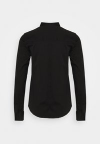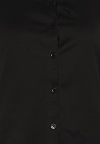 Chemise noire à manches longues en tissu lisse, dotée d'un col pointu, d'une fermeture à boutons sur le devant et d'un ourlet arrondi avec des poignets à boutons.