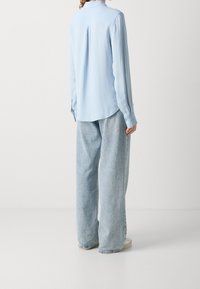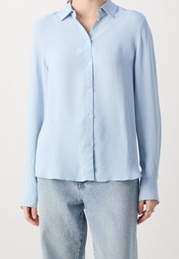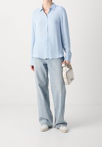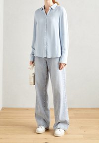 Chemise bleu clair à manches longues avec col, texture à côtes verticales et fermeture à cinq boutons à l'avant, associée à un jean en denim clair.