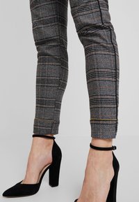 Femme portant un pantalon gris à carreaux avec cordon de serrage et poches zippées, ainsi que des chaussures noires à talons hauts et brides à la cheville, debout sur un fond clair.