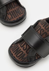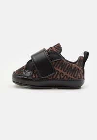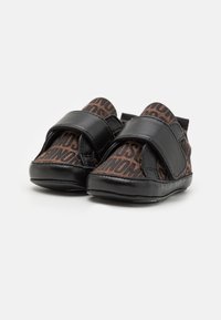 Chaussure pour tout-petit noire et brune avec un dessus texturé présentant un tissu à motif et une sangle Velcro. Bout arrondi et semelle flexible.