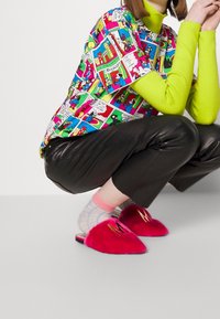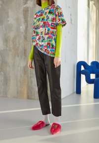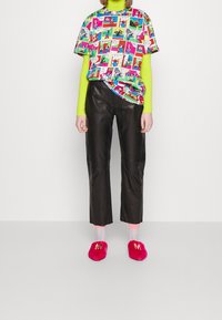 T-shirt à imprimé coloré de style bande dessinée, sous-couche à manches longues verte, pantalon en cuir noir, chaussons en fausse fourrure roses avec initiales dorées, chaussettes rayées.
