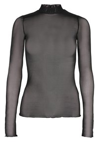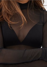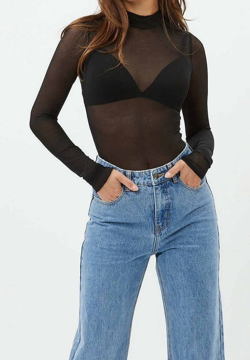 Femme portant un haut noir transparent à manches longues avec un soutien-gorge noir en dessous et un jean en denim bleu clair taille haute, les mains dans les poches.