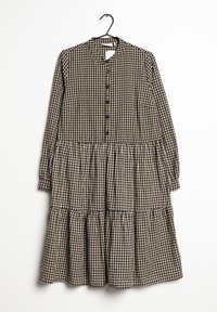 Robe à carreaux noirs et beiges avec un col montant, des manches longues, une fermeture boutonnée sur le devant et un ourlet à volants étagés, confectionnée dans un tissu léger.